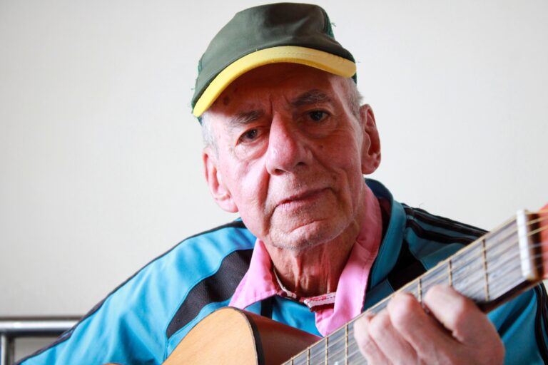 La guitarra de Ariel Gallego ya no suena por las calles de Marinilla. Desde el 3 de octubre solo suena en el asilo San José. Foto: Miguel Becoche Quintero.