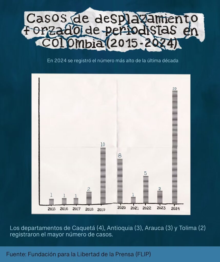 Las historias de periodistas que han tenido que desplazarse forzosamente y exiliarse se suman una tras otra para confirmar una cifra alarmante del último informe de la Fundación para la Libertad de Prensa (FLIP) sobre la violencia contra el periodismo en Colombia: en 2024 el desplazamiento forzado duplicó el récord anterior de 2019, y lo configura como el peor año de la última década.