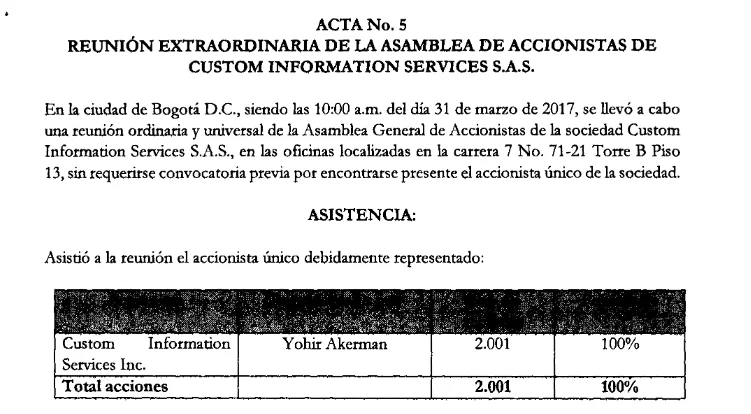 El nombre de Akerman aparece por primera vez en 2017. El 31 de marzo de ese año se adelantó una asamblea de accionistas de CIS y el columnista asistió como representante de Custom Information Services INC. Es decir, recibió el poder de la compañía accionista con sede en Miami para representarla en la reunión de su filial en Colombia. Así quedó consignado en el Acta #5 de CIS.