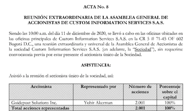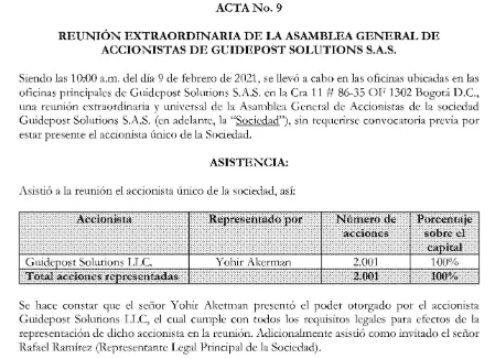 El 9 de febrero de 2021 se llevó a cabo una reunión extraordinaria de accionistas de Guidepost Solution S.A.S. Su único accionista es Guidepost Solutions LLC y el representante era Yohir Akerman, quien fue elegido gerente. En esta reunión hicieron un cambio en el modo de escogencia de representante legal. Fuente: Acta #9.