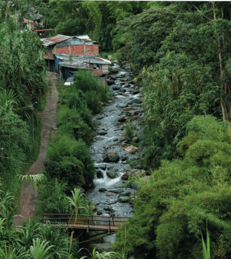 Además de la porquinaza y los olores de empresas como Biociclo, a la Doña María le andan creciendo “unos barrios subnormales, ilegales, informales, alrededor de la cuenca. Se están construyendo casas que no respetan la ley ambiental de 20 metros” hasta el cauce, cuenta Génesis. En esas casas no cocinan con el agua que les pasa por el lado, sino que la ensucian más. Poco a poco, la Doña María se quedó sin playas y se están quedando sin agua los habitantes de San Antonio de Prado.