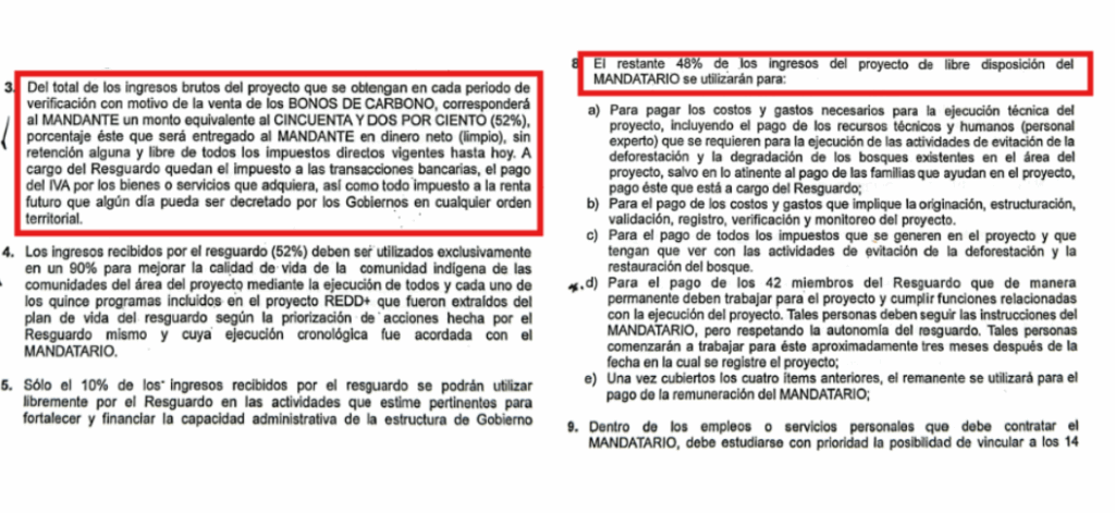 En el papel, el contrato parecía estar blindado gracias a una cláusula que estipulaba que cada quien manejaría su parte de los ingresos generados por el proyecto: 48 % para la empresa y 52 % para los indígenas. Incluso, como parte de ese programa, se creó un Consejo REDD+ compuesto por cinco autoridades de CMARI, encargadas de administrar “directamente” los recursos del resguardo que, para mayor seguridad, serían depositados en “por lo menos dos negocios fiduciarios separados”, vigilados por el Estado. Mientras que Human Forest insistió luego en avalar los pagos para evitar que se les dé un mal uso.