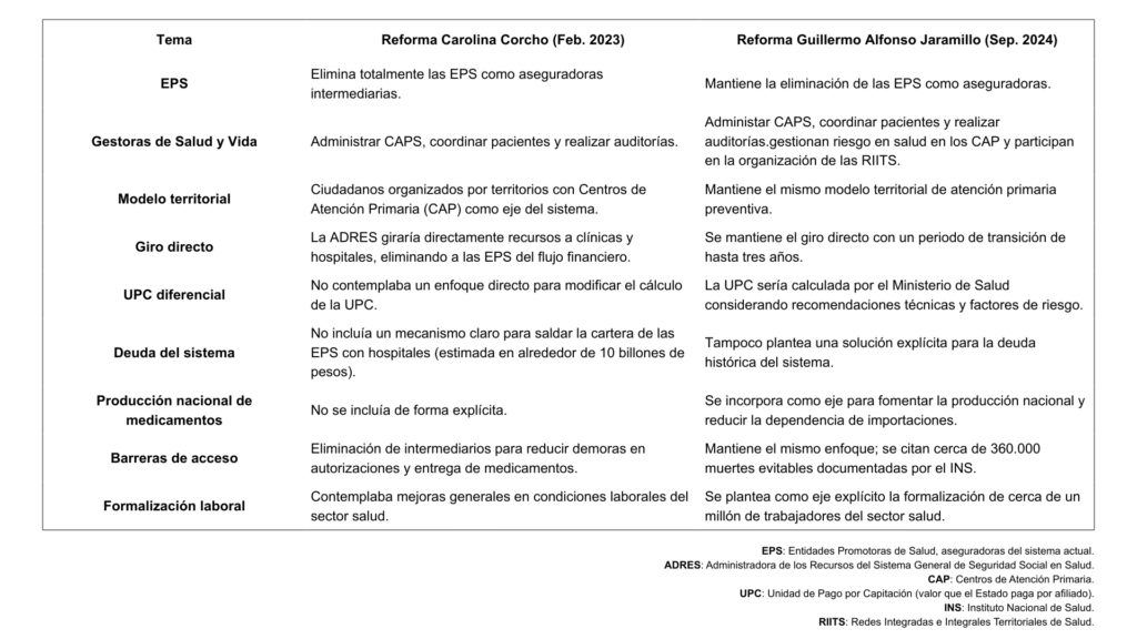 La reforma a la salud ha sufrido múltiples cambios respecto a la radicada en 2023 por Carolina Corcho. El mayor de ellos realizado por el ministro Guillermo Jaramillo en 2024 (ver cuadro).