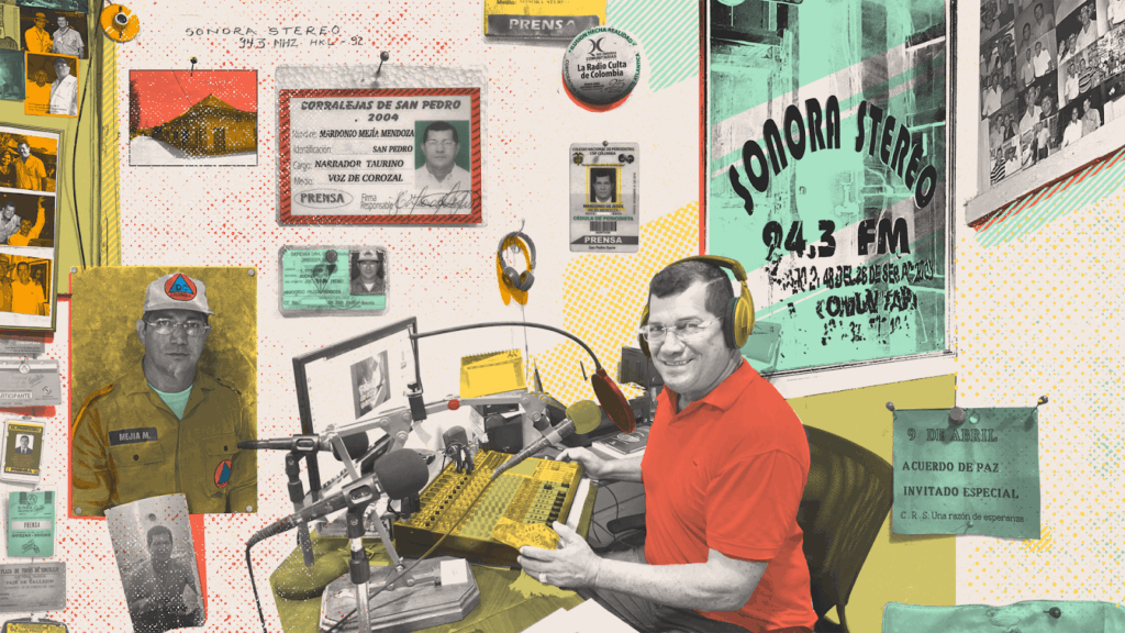 Un sicario mató a Mardonio Mejía Mendoza el pasado 24 de enero cuando entraba a su emisora en el municipio de San Pedro. Con su muerte no solo se apagó la voz de un periodista, líder local y ganadero, sino que desapareció el noticiero de la única radio del pueblo. El hecho deja una sensación de temor y zozobra entre sus colegas que enfrentan a diario la precariedad laboral y la autocensura. Collage: Felipe Rivera Echeverri. IG: @ojito__apagado Un hombre recorre en moto el centro de un municipio de 22 mil habitantes. Lleva un parlante y un letrero donde aparece su nombre, su número de contacto y la palabra “publicidad”. Generalmente anuncia la venta de productos, promociones de almacenes y da avisos de todo tipo. Es miércoles 31 de enero. Walter Chamorro —ese hombre que también es periodista y corresponsal de radio— hace perifoneo en San Pedro, departamento de Sucre, para invitar a la población a la misa del novenario que se realizaría al día siguiente por la muerte de su colega Mardonio Mejía Mendoza, de 66 años. Chamorro también anunció el entierro de Mardonio con este método. Unos días antes, un sicario sorprendió a Mejía por la espalda y le disparó. Según los habitantes y las autoridades, esto es algo que no suele ocurrir en San Pedro, incluso en el contexto violento del departamento. Aseguran que este es un municipio “tranquilo”: del total de 340 homicidios registrados en Sucre el año pasado, cuatro pasaron acá. El ataque provocó conmoción, no solo por tratarse de un sicariato, sino porque fue contra una de las personas más reconocidas del pueblo; el pionero de todas las formas de comunicación en ese lugar: hace más de 30 años Mardonio Mejía lanzó Promej Televisión, el primer canal local, y publicó La Plana, el primer periódico. También era el dueño de la emisora comunitaria Sonora Estéreo 94.3, la única radio del municipio, en la que se transmitía Amanecer Campesino, el noticiero que conducía. “Presentamos las noticias con un estilo diferente, un estilo propio, natural, auténtico, y con el verbo nuestro, de la gente de acá, de la sabana del departamento de Sucre”, solía decir Mejía en sus transmisiones por FM que también difundía por Facebook. “Era un pulpo; era un enamorado del agro, y compaginaba esa pasión con el periodismo, que también lo llevaba en la sangre”, recuerda Walter Chamorro. “Ahora la emisora está apagada; cuando asesinaron a Mardonio silenciaron la voz de los que no tenían voz”, añade. Su colega Manuel Morón, presidente del Colegio Nacional de Periodistas, seccional Sucre, gremio al que pertenecía Mejía, describe el vacío así: “El municipio de San Pedro queda huérfano ante la pérdida de un valioso personaje que de verdad, verdad, era la voz de San Pedro”. El 24 de enero, el día del asesinato, Mardonio Mejía repitió en su noticiero —como lo hacía cada día y sin sospechar que sería su última emisión—que el programa estaba dirigido a los campesinos, “para que aprendan oyendo radio”. Se despidió anunciando la programación que seguía: rancheras y boleros. En el noticiero contó que ese día tenía previsto ir a una subasta. Mejía era además ganadero y se dedicaba a actividades del campo. Al terminar el evento, se dirigió a su casa solo. Una cámara de seguridad registró el momento en el que Mardonio Mejía llega —recién caída la noche—, se baja de la moto, abre la puerta, se sube de nuevo y la guarda. En ese momento otra moto se detiene frente a la puerta. De ella desciende un hombre y el conductor lo espera. Entra y sale enseguida. En la grabación solo se ve lo que ocurre afuera. Adentro Mejía había recibido dos tiros por detrás, en la cabeza. Su cuerpo quedó encima de la moto y abajo de las letras Sonora Estéreo, grabadas sobre un vidrio, a la entrada del lugar. Justo detrás del sitio del ataque está su estudio con las paredes repletas de fotos de coberturas periodísticas para diferentes medios y junto a personajes diversos, también se exhiben credenciales de prensa y una pizarra con el detalle de la programación diaria. En otra parte de la casa hay más fotos, incluida una con el uniforme de la Defensa Civil, organismo al que perteneció. De su tiempo haciendo video quedaron repisas con decenas de casetes: “Documental de San Pedro”, “Toros de Sincé. 2004”, “Comerciales”, “Difuntos de San Pedro”, cumpleaños, quince años, primeras comuniones. Mardonio Mejía, que aprendió de periodismo haciéndolo desde hace más de 35 años, también era la memoria del pueblo. Incluso en un documento oficial sobre el “mapa cultural de Sucre” se recoge el trabajo de documentación que hizo sobre las construcciones tradicionales de San Pedro y su patrimonio material, arquitectura de “estilo antillano” o isleño, dicen los expertos. Se trata de un álbum digital con fotografías y reseñas de cerca de 300 casas del municipio. Las calles de San Pedro están llenas de pequeños negocios; en muchos encendían la radio para escuchar el noticiero de Mejía o la dejaban prendida para acompañar el día con música. Por más de una semana el silencio reinó. Como en otros pueblos pequeños, la iglesia y el parque son el centro alrededor del que gira todo y las motos son el transporte principal. Hubo épocas de bonanza como el boom algodonero en el siglo pasado o de la explotación de gas. Hoy no hay algodón, ni gas; hay ganado y agricultura. “El pueblo en estos momentos siente su ausencia y hasta las mismas personas que decían no estar de acuerdo con él sienten la importancia de una emisora en el pueblo”, dice Angélica Mejía, la hija mayor de Mardonio que en un tiempo trabajó con él y ahora vive fuera del país. Destaca la influencia de su padre: “Aquí las personas, como se dice coloquialmente, creían que lo que él decía era misa”. También admite que la forma de ser, directa, jocosa y a veces controversial, podía molestar