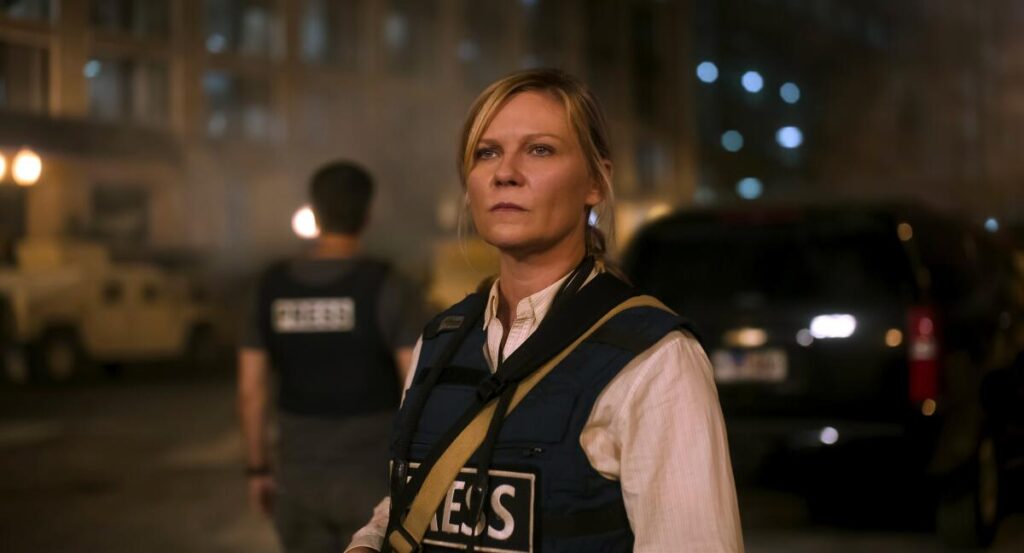 Civil War se desarrolla en un futuro no muy lejano, en torno a la experiencia de un grupo de periodistas que viaja por los Estados Unidos durante una guerra civil que envuelve a la nación. La veterana fotógrafa de guerra Lee Smith, su colega Joel, la joven aspirante a fotógrafa Jessie Cullen y su mentor Sammy buscan dirigirse a Washington D.C. para intentar entrevistar al presidente antes de que el grupo secesionista más fuerte, “Las Fuerzas Occidentales”, lideradas por los estados de Texas y California, llegue a la capital. Kirsten Dunst interpreta a Lee Smith en Civil War. Foto: fotograma de la película. ¿Por dónde se empieza a analizar esta película? Se puede decir que Civil War logró retratar de tal manera la crueldad de la guerra que todos estos detalles parecen imposibles de contar; gran parte de la audiencia parece estar de acuerdo en que la película está a la altura, pues recibió una aprobación del 81% entre 348 reviews en el sitio web Rotten Tomatoes. Según esta página, el consenso de la crítica es que Civil War es una mirada de cerca a la violenta incertidumbre de la vida en una nación en crisis; mientras que el pensamiento de la audiencia coincide en que la película hace un buen trabajo de ubicar al espectador acercándose a su realidad, aunque puede ser frustrante para los que quieren saber la razón por la que empezó el conflicto. ¿Será esto verdad? En teoría, la premisa se presta para mucha acción. El británico Alex Garland fue el encargado de dirigir Civil War. Conocido por su estilo visualmente distintivo y sus narrativas reflexivas, Garland se ha ganado una reputación en la industria por explorar temas complejos con profundidad y originalidad, siendo un ejemplo de esto sus trabajos en Exmachine y Anihilattion. La película fue producida por A24, un estudio reconocido por su cine independiente de alta calidad, habiendo respaldado éxitos como ‘Moonlight’ y ‘Lady Bird. En este sentido, al ver esta película se debe contar con una disposición diferente a la tradicional; el punto principal no es el porqué de la guerra, a lo que se debe poner atención es a la manera en que los protagonistas se desenvuelven en la historia. La parte más importante de la trama es la experiencia de la “protagonista” Lee Smith. Ella es una fotoperiodista de guerra muy conocida que se ha enfrentado a numerosos campos de batalla, incluso antes del estallido de la guerra civil. Esto se demuestra desde el principio de la película, donde tiene una actitud fría y calculadora no solo al disparar la cámara, también en las relaciones con sus compañeros. Mientras avanza la historia, nos damos cuenta de las secuelas que le ha dejado retratar tal crueldad en sus fotografías, siendo este uno de los puntos fuertes de la película. No es necesario mostrarla gritando y sufriendo para revelar que padece estrés post-traúmatico, con una simple escena en el baño Garland retrata su expresión preocupada, e incluso la actitud que toma con Jessie, la aspirante a fotógrafa, demuestra una profunda preocupación por lo que le pueda pasar a la chica porque ella que lo ha visto todo, sabe lo cruel que puede llegar a ser la humanidad. En este sentido, la historia de Lee toma fuerza gracias al realismo de su personalidad y la manera en que interactúa con Joel y Sammy. La actriz Kirsten Dunst hace un gran trabajo mostrando a su personaje con problemas para expresarse asertivamente producto de la guerra, y en ningún momento se muestra como una protagonista cliché que va en busca de sus sueños. Lee es una fotoperiodista de renombre que no necesita conseguir nada, y gracias a esto la realidad logra representarse desde la guerra y el porqué del periodismo en un contexto tan extremo, sin caer del todo en el papel de la protagonista o incluso en las razones de la guerra misma. Lo más importante terminan siendo las reflexiones que se generan en torno a la profesión y a la realidad misma. Para empezar, el momento en que están iniciando su viaje y pasan por uno de los “controles fronterizos”, hay una familia completa que va en sentido opuesto, escapando del conflicto. Esto ubica al espectador en la situación que van a vivir los periodistas, y es que el grupo no sabe a lo que se enfrenta, o quizá sí, pero continúa a pesar del peligro. En segunda instancia, se genera una discusión durante el viaje a Washington del porqué siguen tomando fotos y publicando a pesar de que muchos de los periódicos ya han quebrado. Lee se enoja y dice que el trabajo del periodismo es registrar para que otros pregunten, y que los fotoperiodistas no se cuestionan su realidad, sino que la retratan en fotografías para que la gente las vea, se entere de lo que está ocurriendo y que la audiencia sea la que se forme su propio juicio. Esta posición es contradictoria con la actitud de los padres de Jessie y de la propia Lee, que se encuentran en granjas aisladas del país y alejadas del conflicto, fingiendo que nada está ocurriendo. Esto plantea la discusión sobre el poder del periodismo no solo en un contexto de caos, sino en el mundo real. ¿Cuánta gente deja de consumir contenidos informativos porque dicen estar cansados de siempre escuchar malas noticias? Este argumento es muy fuerte porque lleva a pensar que, si la audiencia no se interesa por lo que está ocurriendo, como los padres de Jessie, el periodismo no tendría sentido… Bueno, lo que ocurre es que a lo largo de la película, todos los retratos de guerra muestran una cercanía que incluso se puede tornar incómoda, pero que retratan a la perfección todo el daño que puede llegar a hacer el humano. Por esto la película ha sido tachada en Estados Unidos como irresponsable, ya que en este mismo año pronto serán las elecciones presidenciales del país, lo que ha generado que muchos insinúen que la película está